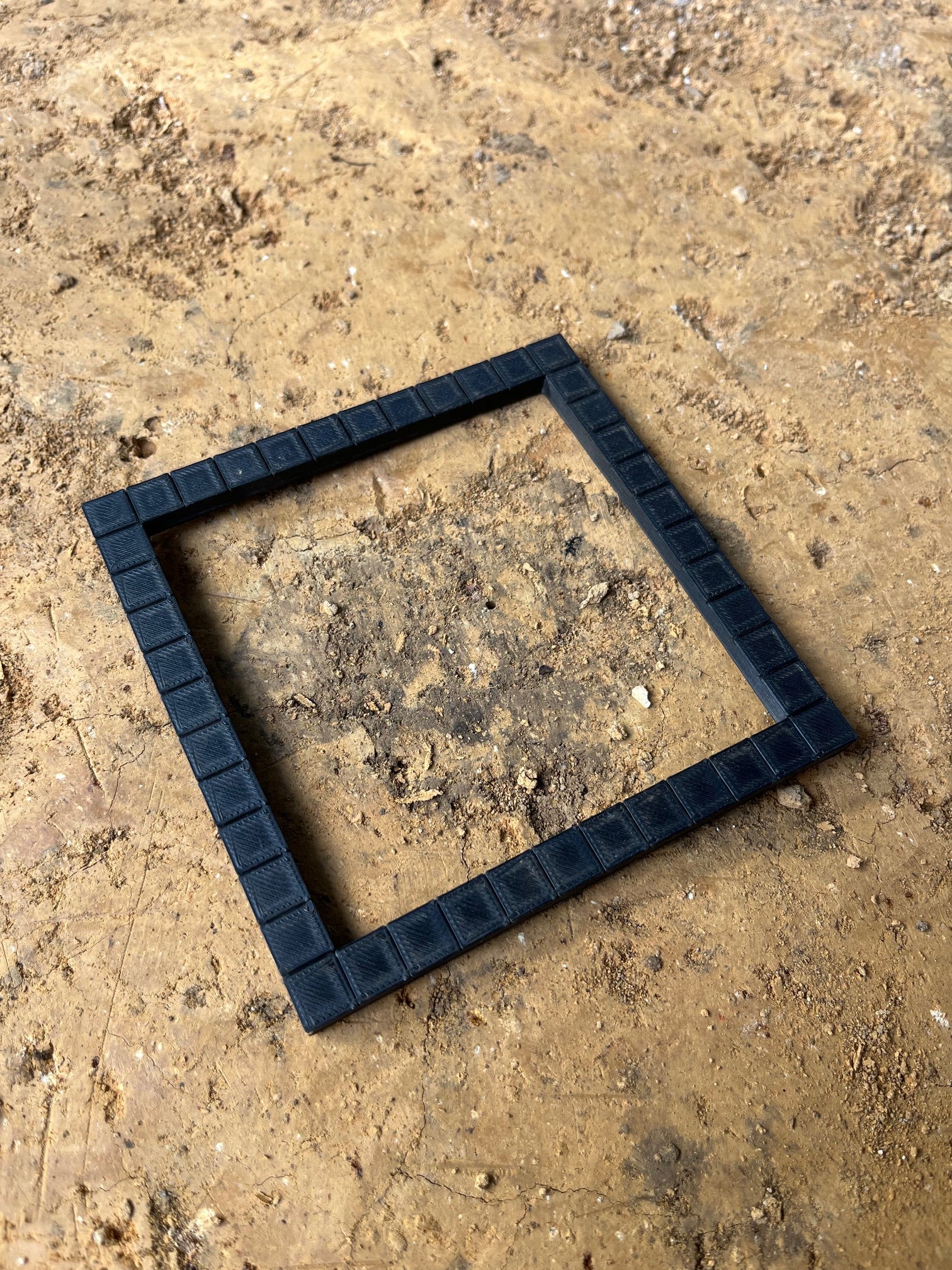 A handy little multipurpose scale for drawing. With centimeter notches around the edge of one side, and a straightedge on the other, this tool is handy for measuring and drawing posthole features, or just any time you need to draw a perfect square.